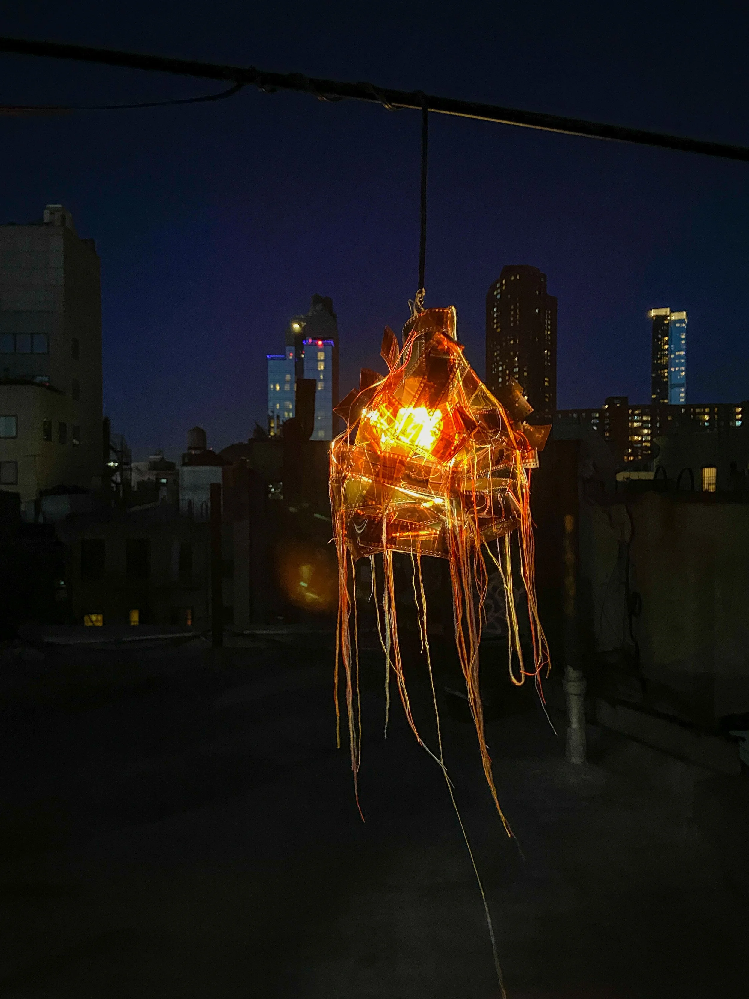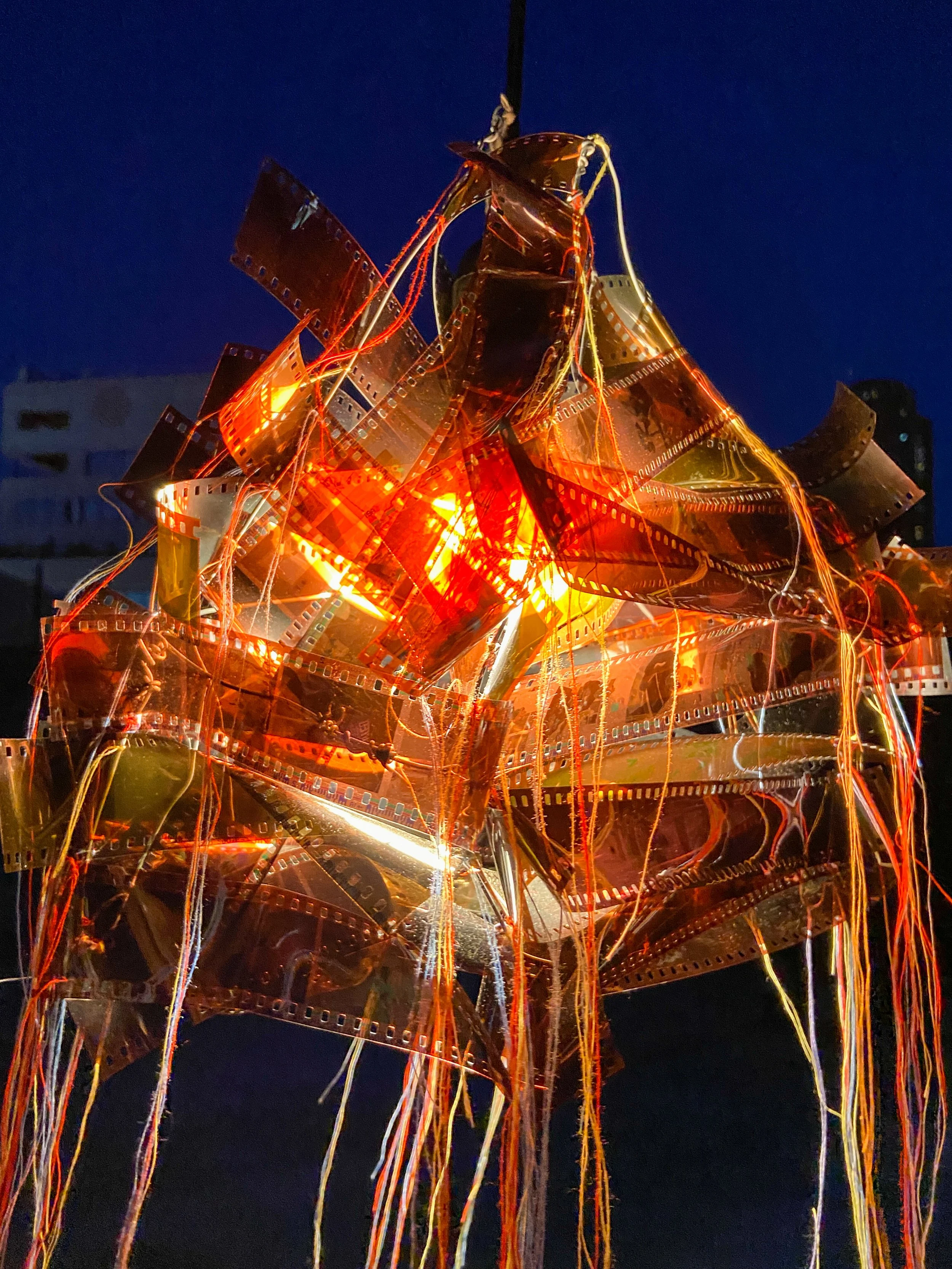 “Do you think of me as often as I think of you?” is a sculpture created from 4 years of documenting family and friends, in an effort to better connect and become more of an active participant in the lives of those I care for. While initially developing towards a series of portraits, my family felt uncomfortable with the revealing of family secrets in such a direct manner. Taking this into heart, I took the film negatives and created a house-like form with the negatives around a light bulb. When looking closely, you can see faint and overlapped portraits of my loved ones. Home is a safe place in my family.